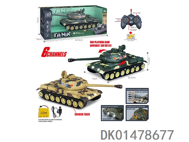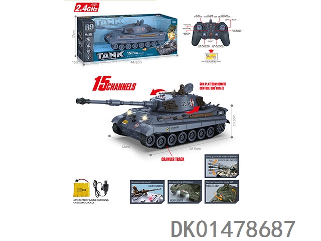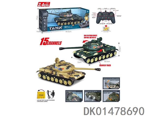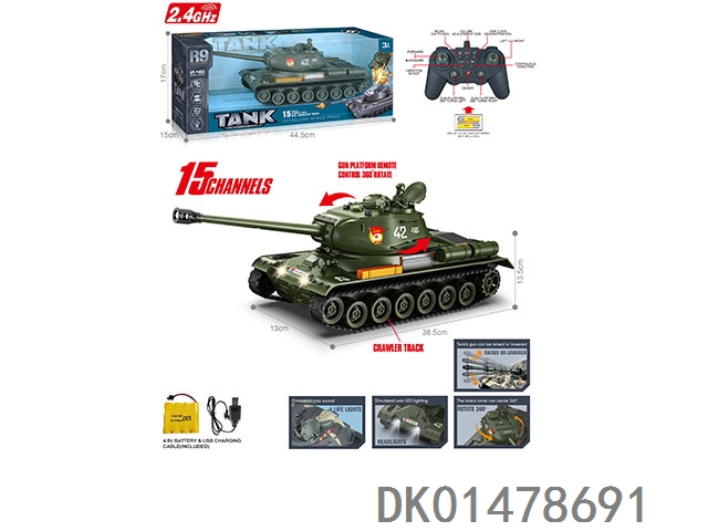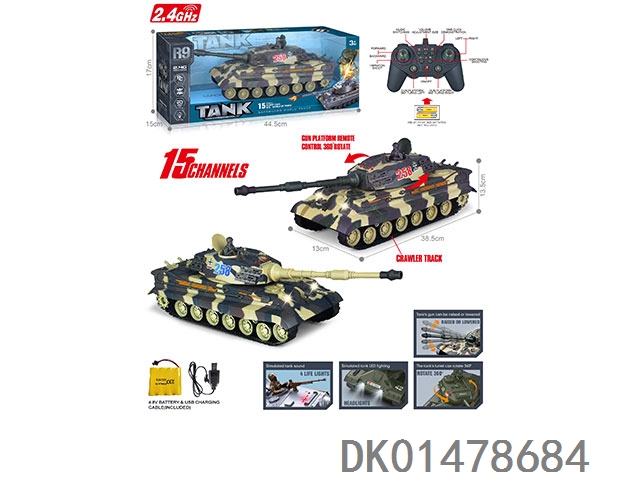 2.4G 十五通带灯光声音、红外线对战、一键演示、炮台可360度遥控旋转、遥控履带坦克(包电)