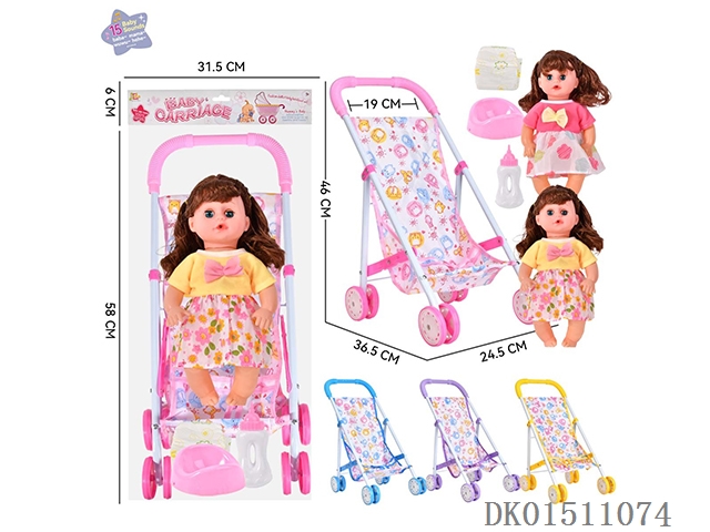 14寸15声女娃喝水撒尿,配奶瓶,尿盆,尿片,铁制推车(推车任选2款颜色混装)
