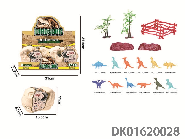 恐龙骨架头收纳盒(12只三寸恐龙+2棵树+石头+1个围栏)6只装