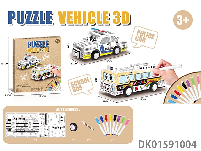 3D警车车+校车+8色笔涂色