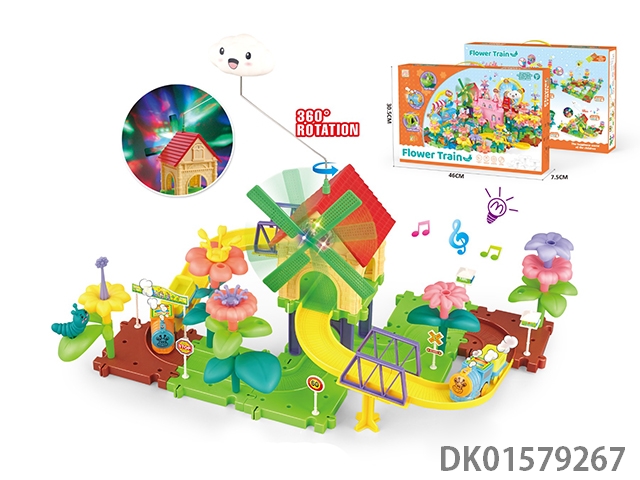 Flower arrangement, assembly, track farm, garden, windmill, 360 degree bidirectional rotation, aerial clouds, lights, music, intelligence, electric train, track, building blocks, 48pcs