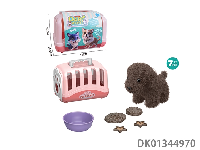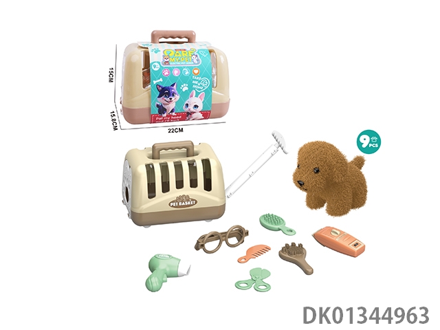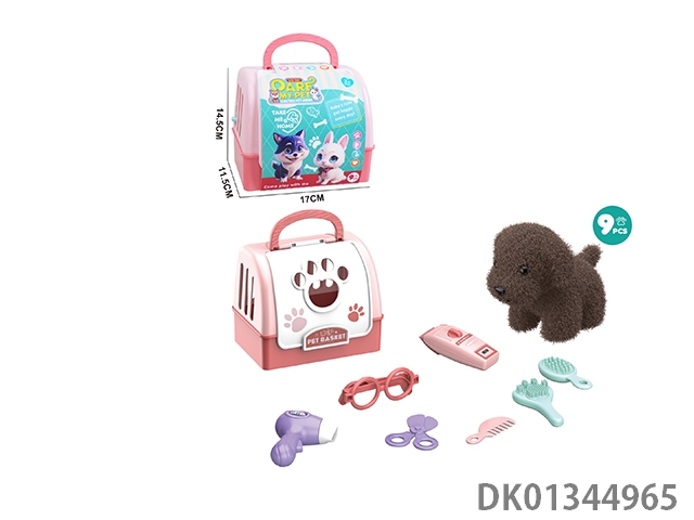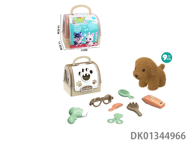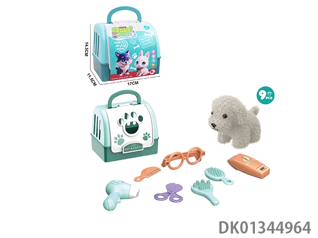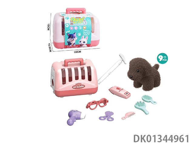 Plush toy pet dog with hair cutting set and hand-held dog cage
