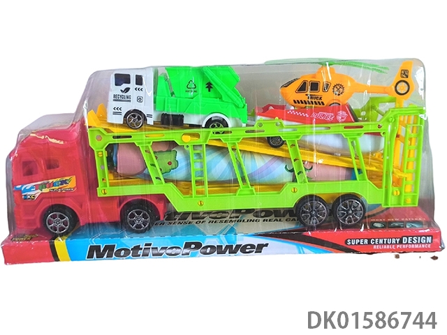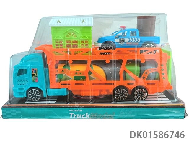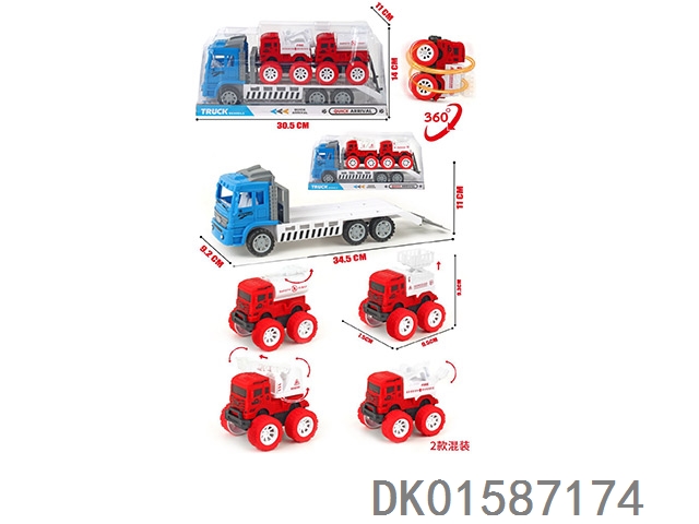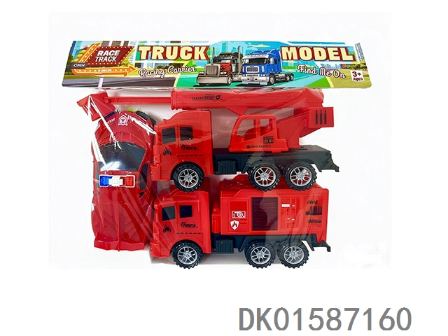 Two inertia fire trucks, one inertia police car, and one coconut tree
