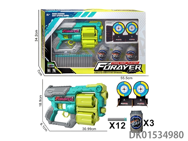 Soft bullet gun (equipped with 12 flat headed bullets) (3 beverage bottles) (1 cardboard target)