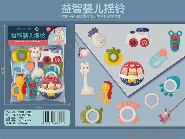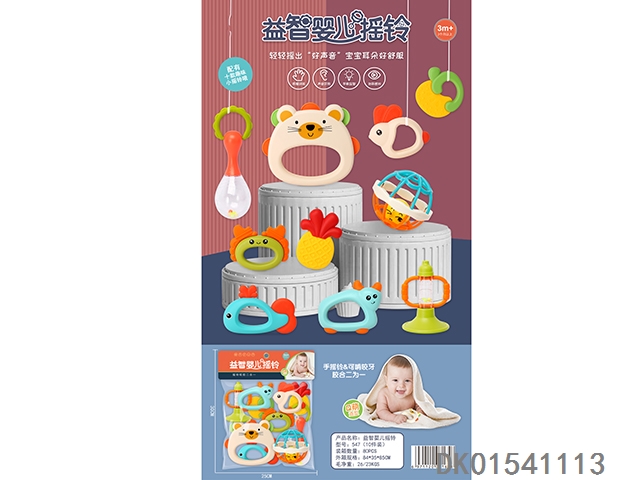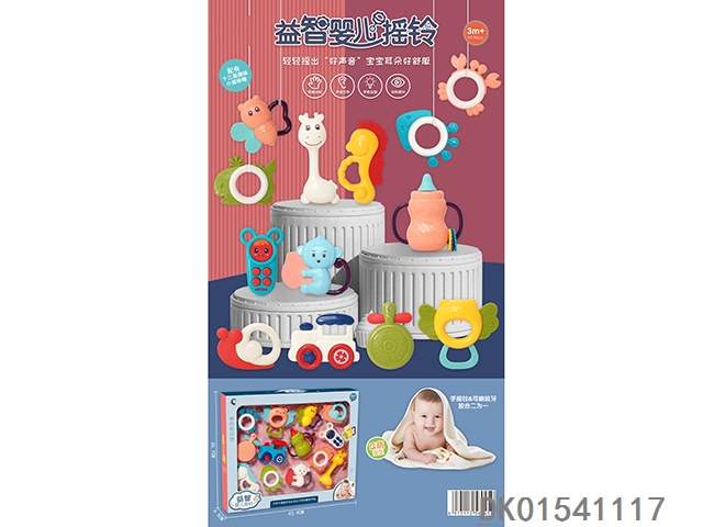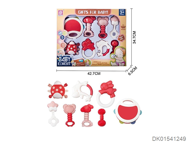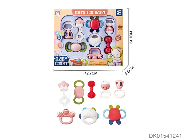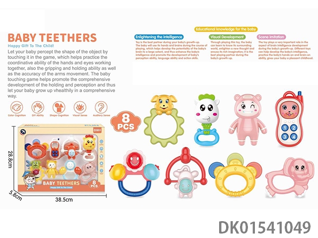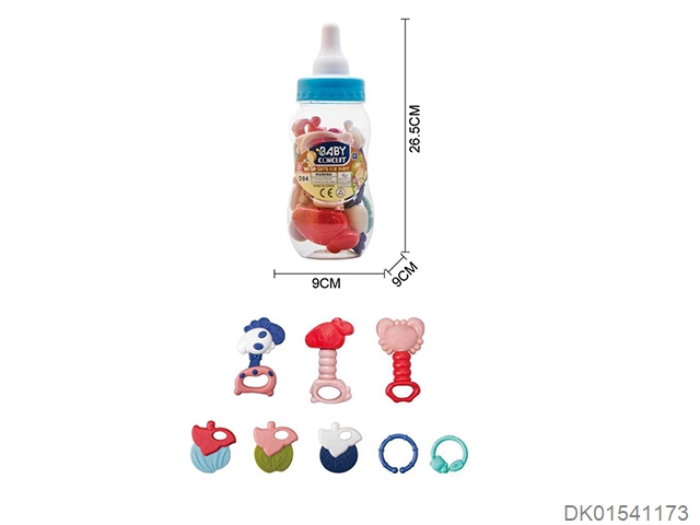 Set of 8 combination rattles (hand clapper, mobile phone, monkey, teething cat, puppy, child, flower basket, elephant) (gcc)
