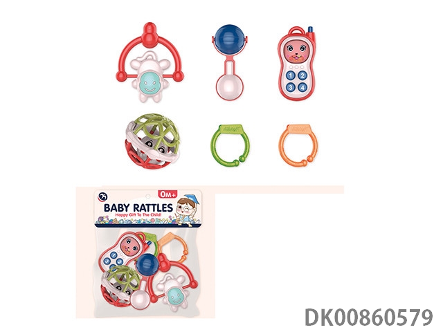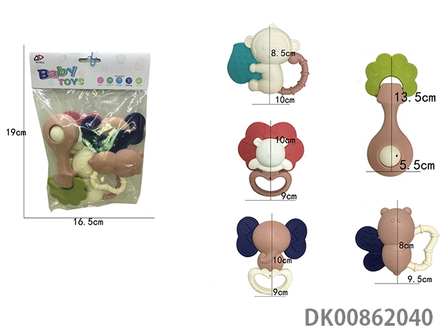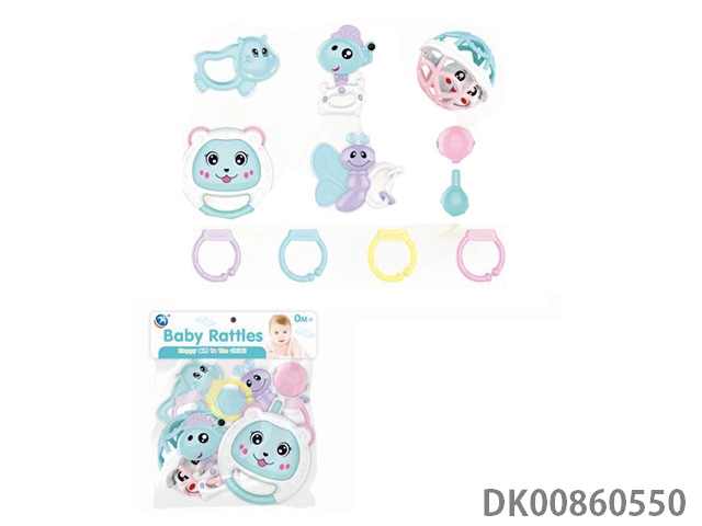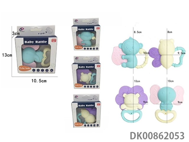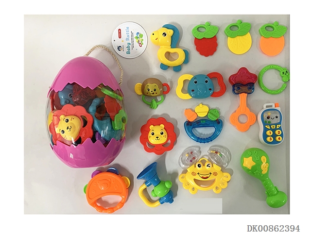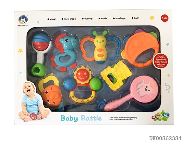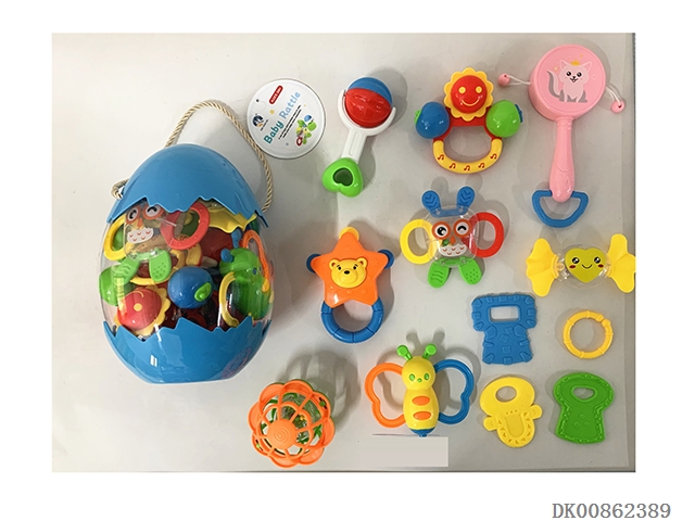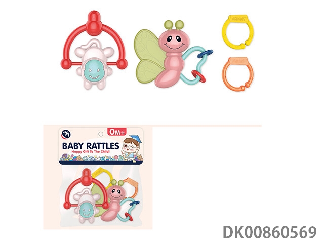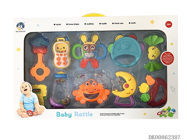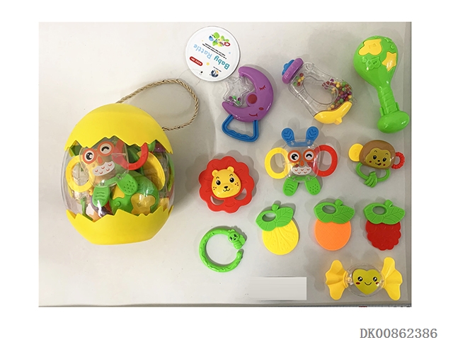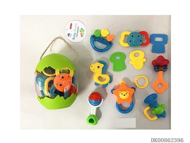 10 Rattles (ball, hand beat tambourine, rattle, hippo, gum deer, gum butterfly, 4 rings)