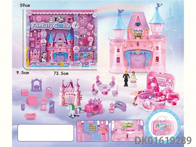 Castle (3 lights, 7 colors, music) with princess prince, furniture, portable storage box with accessories