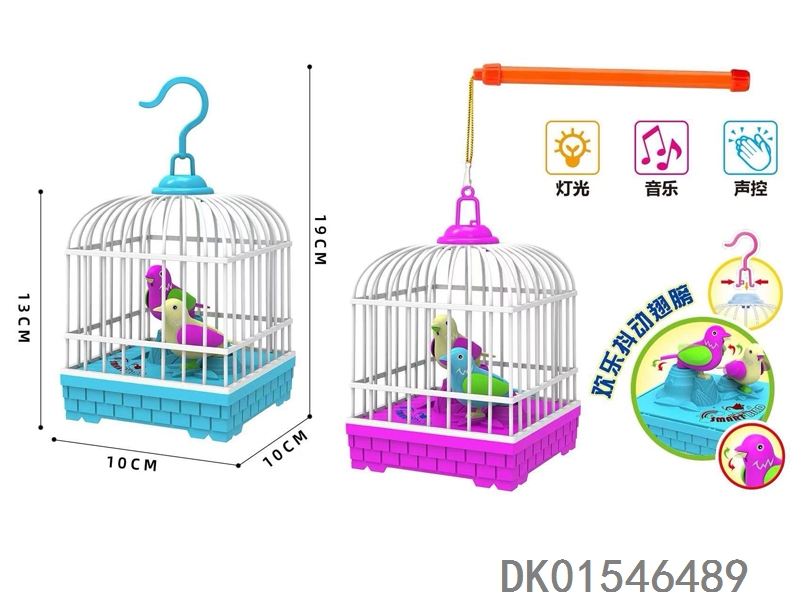 Electric lighting, music, voice controlled birdcage with lantern handle