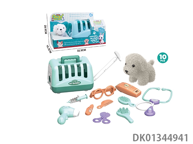 毛绒玩具宠物狗配理发套装+医具套装+拖拉手提狗笼 (2合1)