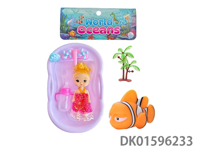 3寸半小萝莉配浴缸,搪胶喷水鱼,奶瓶,树(衣服,发型多款多色混装)