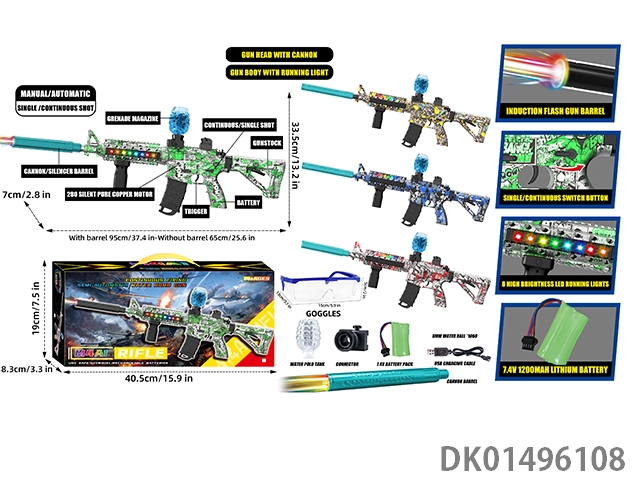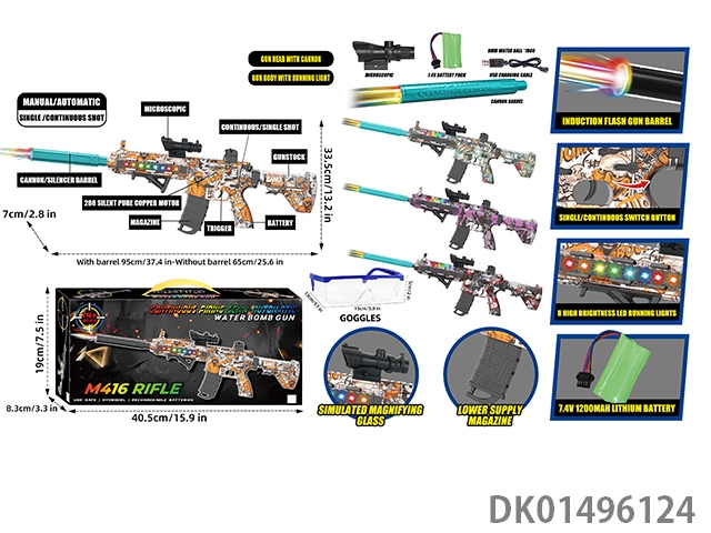 可拆装4节13合1双锂电池供电七彩灯光电动声音大M416突击步枪水球8毫米空气弹射上供弹3种模式射击游戏套装(枪头感应镭射灯炮和枪身环绕流星灯)