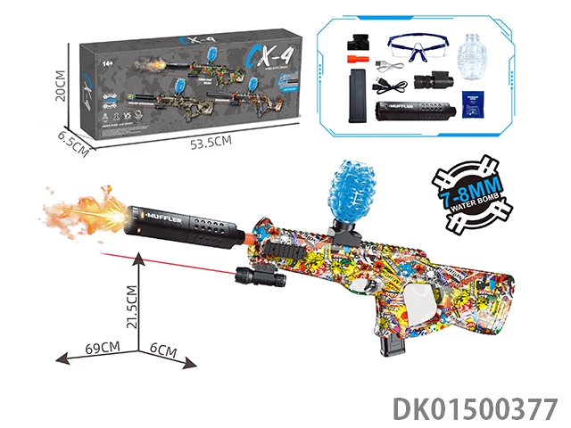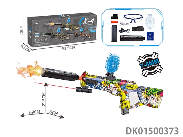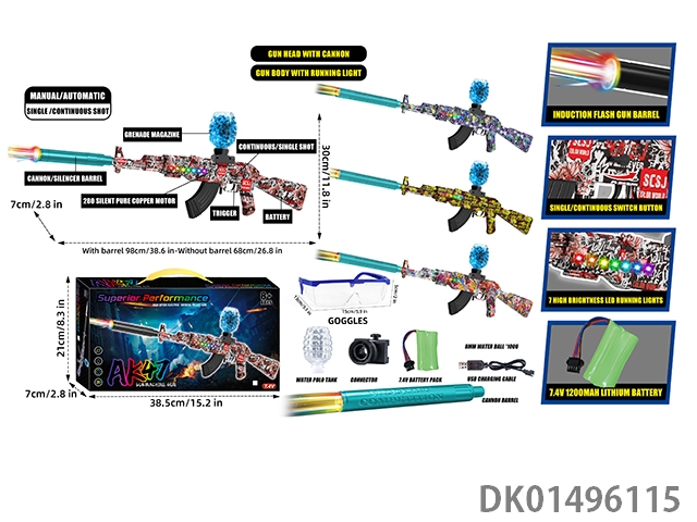 可拆装4节12合1双锂电池供电七彩灯光电动声音大AK47突击步枪水球8毫米空气弹射上供弹3种模式射击游戏套装(枪头感应镭射灯炮和枪身环绕流星灯)