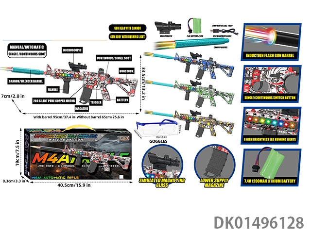 可拆装4节14合1双锂电池供电七彩灯光电动声音大M4A1突击步枪水球8毫米空气弹射上供弹3种模式射击游戏套装(枪头感应镭射灯炮和枪身环绕流星灯)