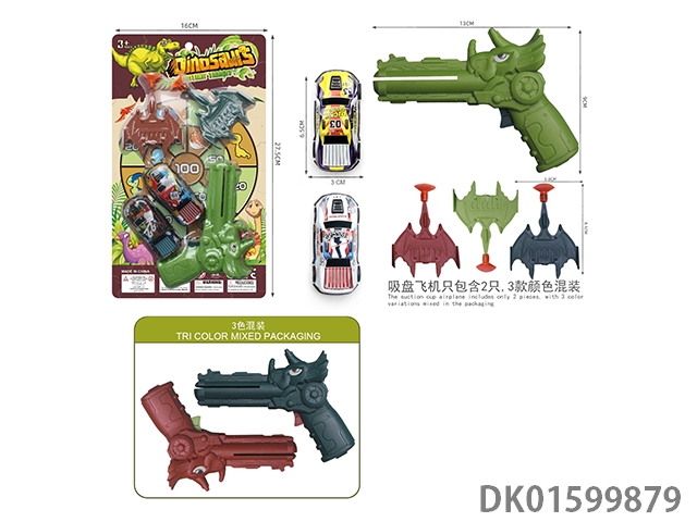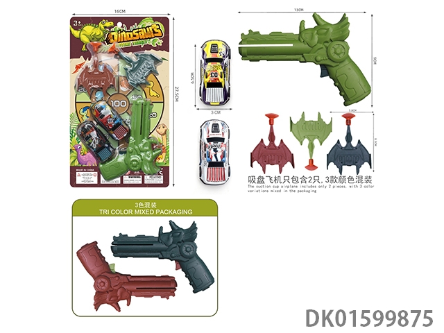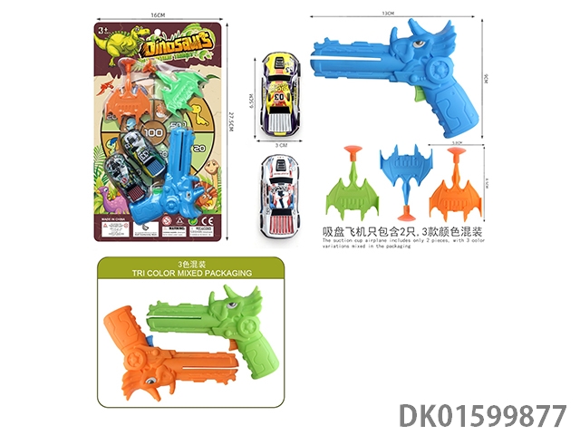恐龙飞机枪(一支枪配2只带吸盘飞机,2只6.8回力车仔,枪3色混装,带