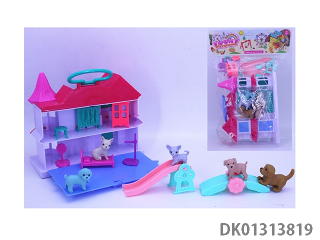 12CM女孩手提翻盖别墅套装(5小狗家具)