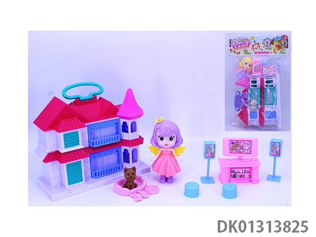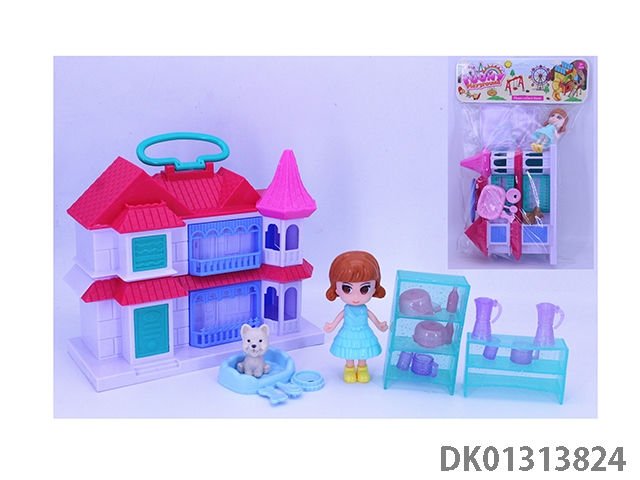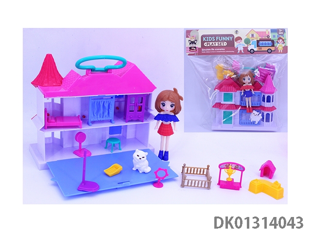 女孩手提翻盖别墅套装(猫狗电脑桌家具)