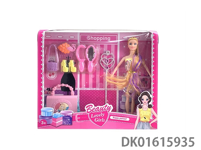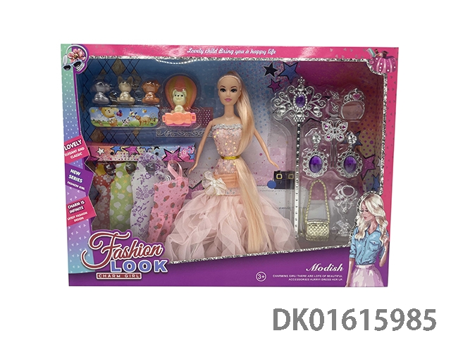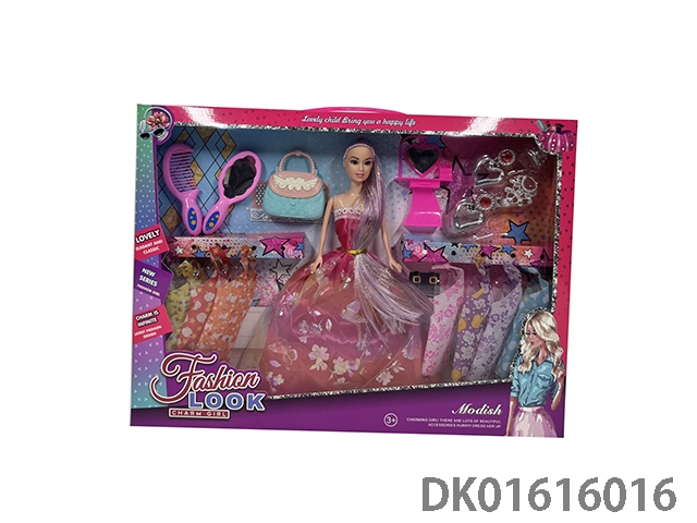 11.5 Inch solid length ponytail evening dress barbie doll girl with clothing, comb, mirror, fashionable handbag, dressing table, earrings, necklace and crown (fashionable barbie princess doll)