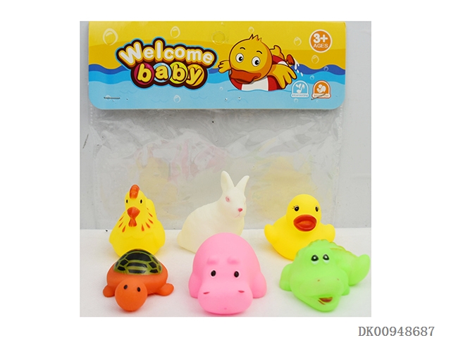 Yellow duckling, white rabbit, light green crocodile, pink hippo, turtle, hen