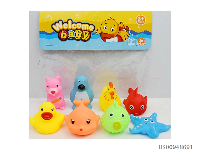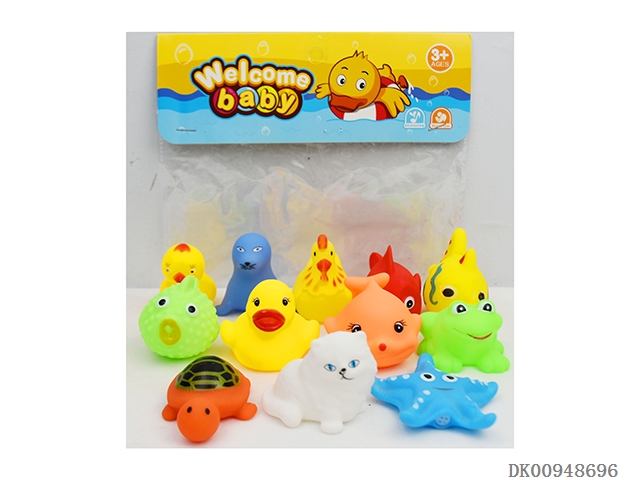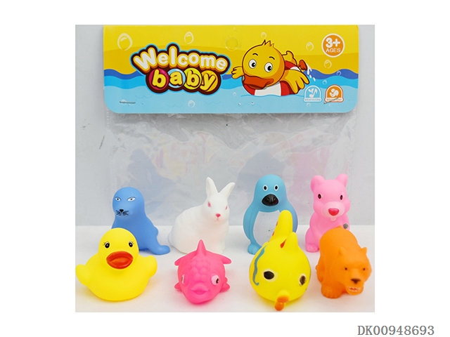 Yellow duckling goldfish. blue penguins white rabbit pink squirrel yellow spot fish orange tiger blue sea lion