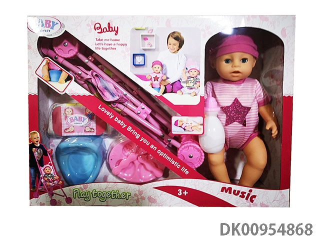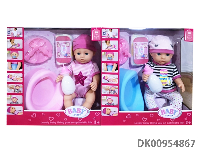 New 16 inch water and urine enamel baby with cart, toilet, dinner plate, urine pants, 6-tone ic