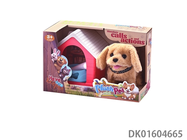 Electric plush golden retriever/beagle with house and food bowl and fishbone