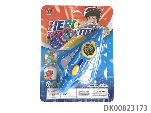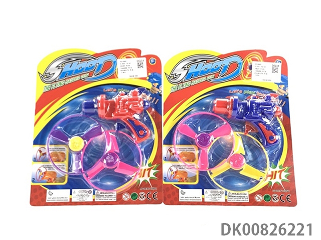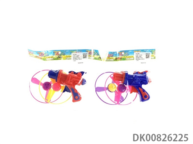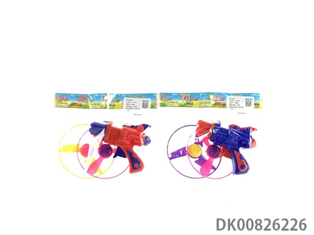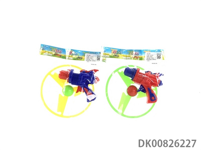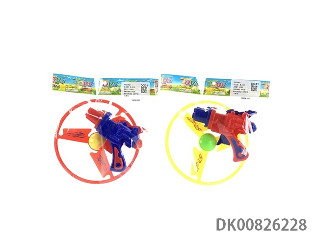 1 Gun and 3 flying saucers and 1 light flying saucer and bouncing top