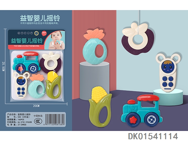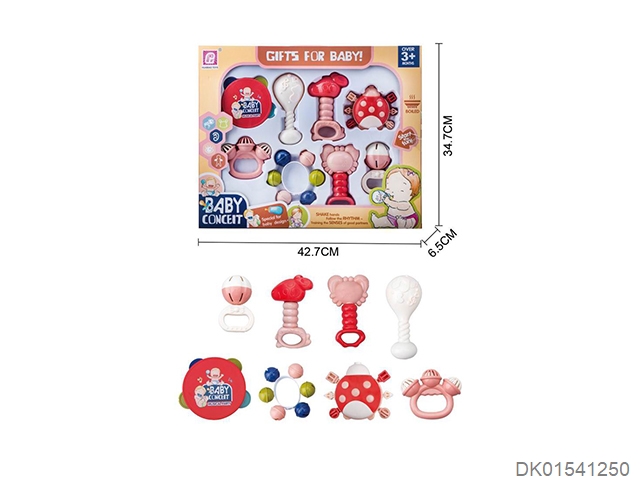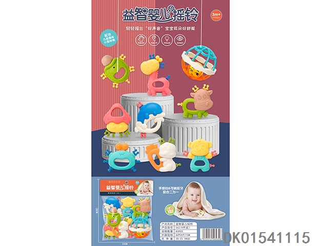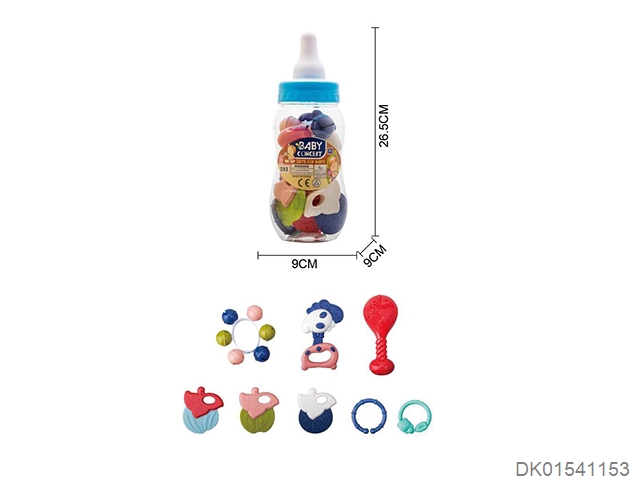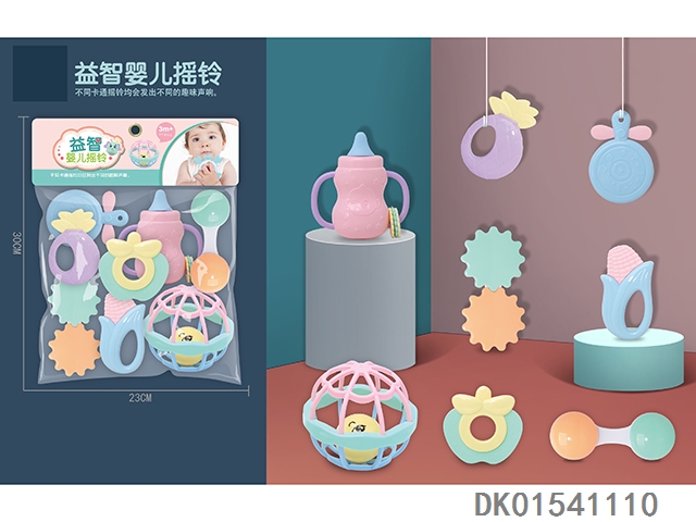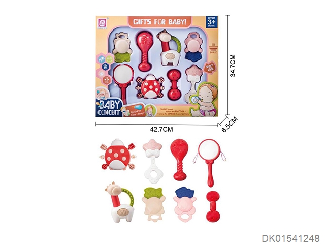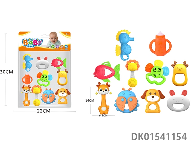 Set of 8 combination rattles (hand clapper, mobile phone, monkey, teething cat, puppy, child, flower basket, elephant) (gcc)