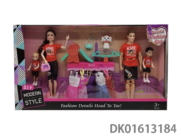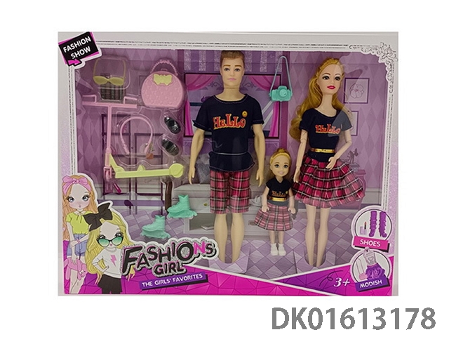 Three person outfit featuring 11.5-inch solid 9-joint fashion barbie, 11.5-inch 6-joint men’s barbie, and 3.5-inch mini barbie with various accessories