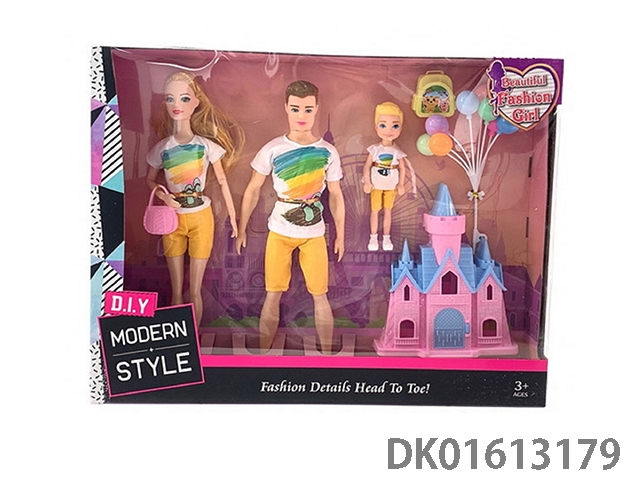 Three person outfit featuring 11.5-inch solid 9-joint fashion barbie, 11.5-inch 6-joint men’s barbie, and 3.5-inch mini barbie with castle and balloon