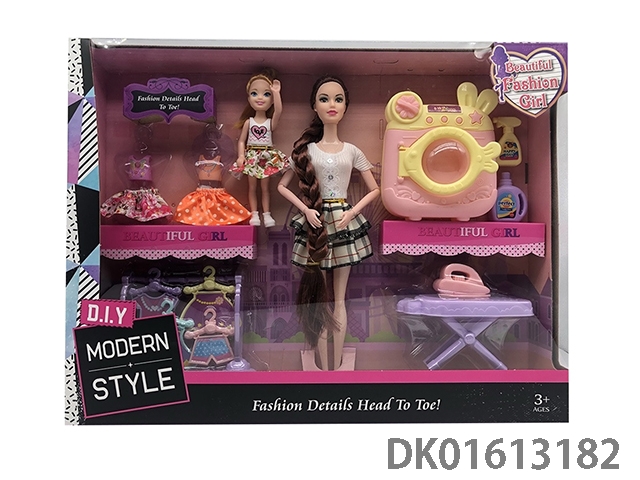 Double outfit 11.5-inch solid 9-joint long braid fashion barbie and 3.5-inch mini barbie with washing machine and various accessories