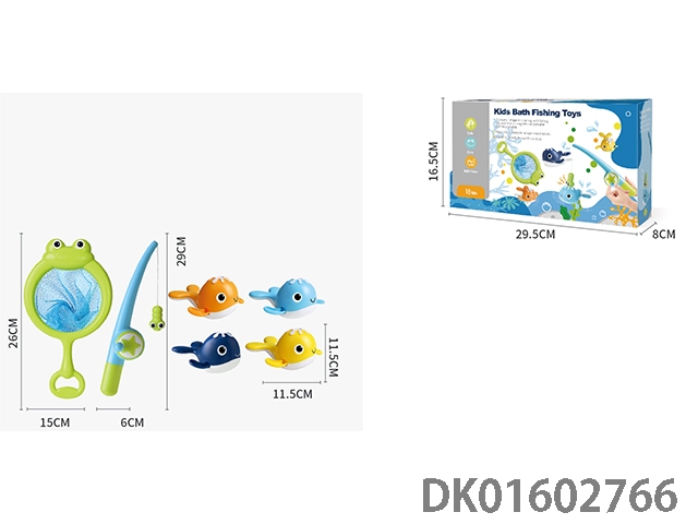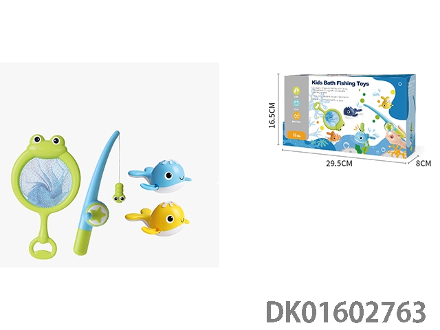 Frog net fishing with fishing rod and 2 fish (light blue and yellow, magnetic)