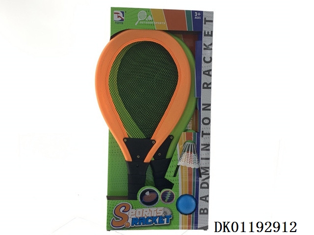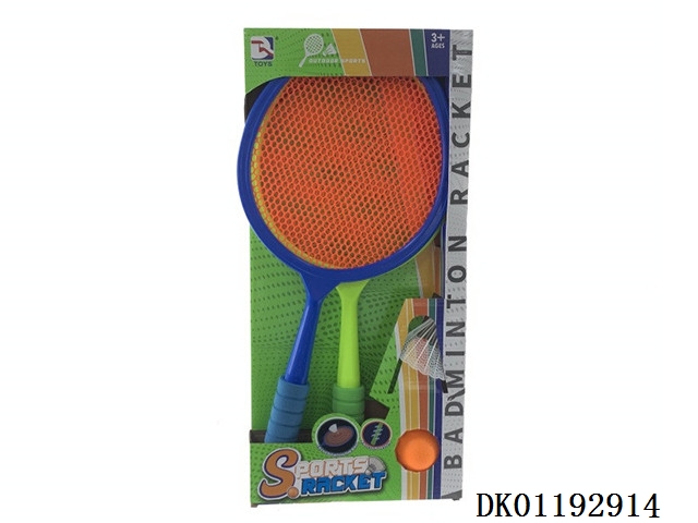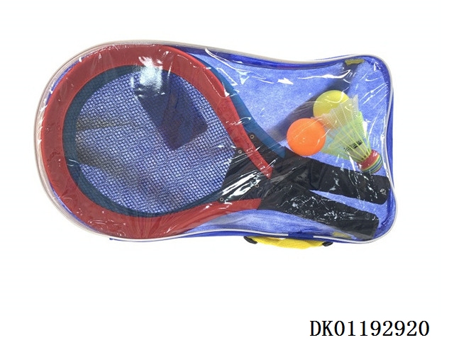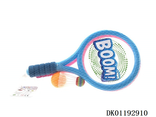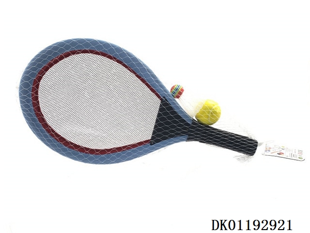 Tennis racket with 2 badminton balls and 1eva1 plastic round ball
