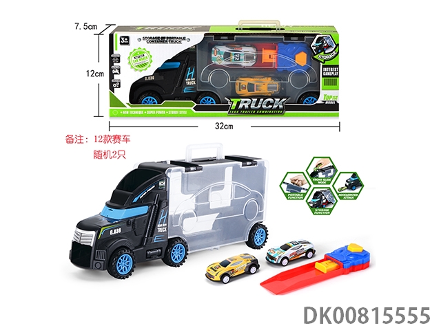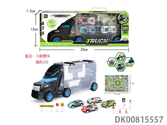Portable gift box container slide tractor with 4 slide iron racing cars, 8 roadblocks and 1 city map