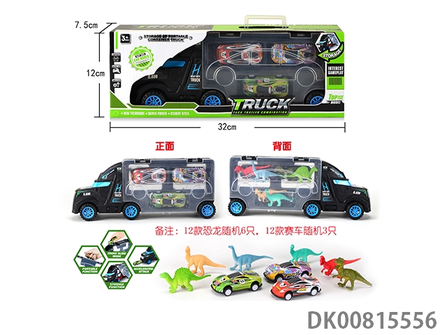Hand held gift box container sliding tractor with 3 sliding iron racing cars and 6 small dinosaurs