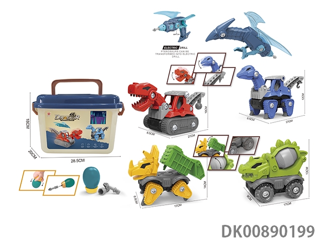 Taxiing function * 4 diy tyrannosaurus rex engineering vehicles, stegosaurus mixer vehicles, brachiosaurus engineering vehicles, 3-horned dragon sanitation vehicles and pterosaur deformation electric drills (electric drills do not include 2 * aa)