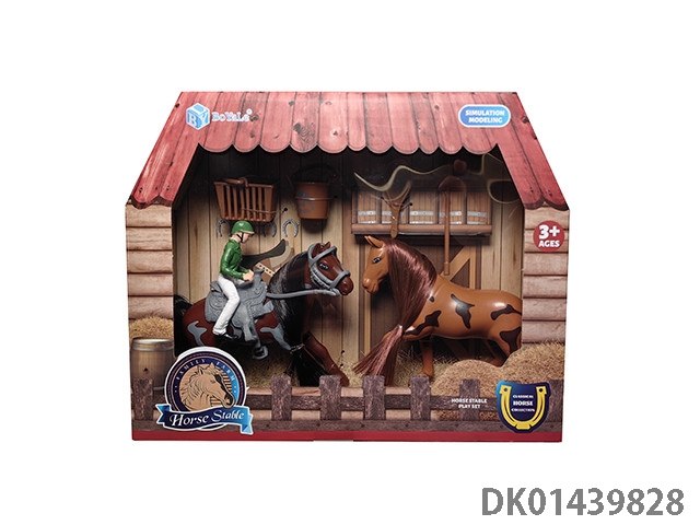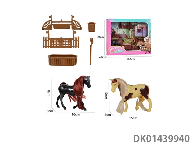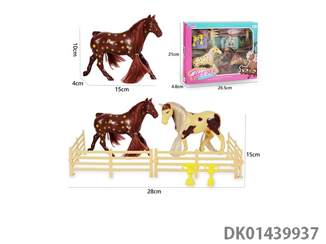 Two simulated horses, fences, and trophy accessories