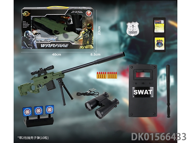 Police kit (military personnel, batons, handcuffs, walkie talkies, badges, binoculars, whistles, gold bullets * 2, hang tags, grenades, and may fourth soft shell guns)