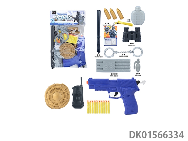 Police kit (baton and hang tag, binoculars and walkie talkie, camera * 2, timed bomb and bullet chain, landmines and gold bullets, compass and bullet clip, and may fourth soft bullet gun)