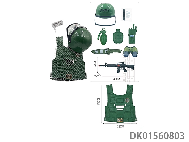 Hat and flint gun, plastic vest, military suit