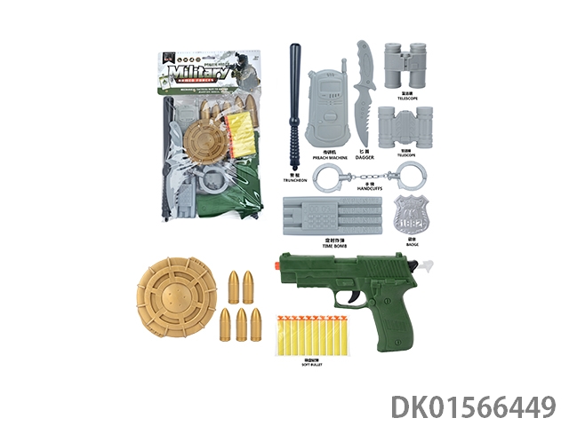 Military kit (baton and hang tag, telescope and walkie talkie, time bomb and camera * 2, bullet chain, landmines and hand grenades, compass and bullet clip, and may fourth soft bullet gun)