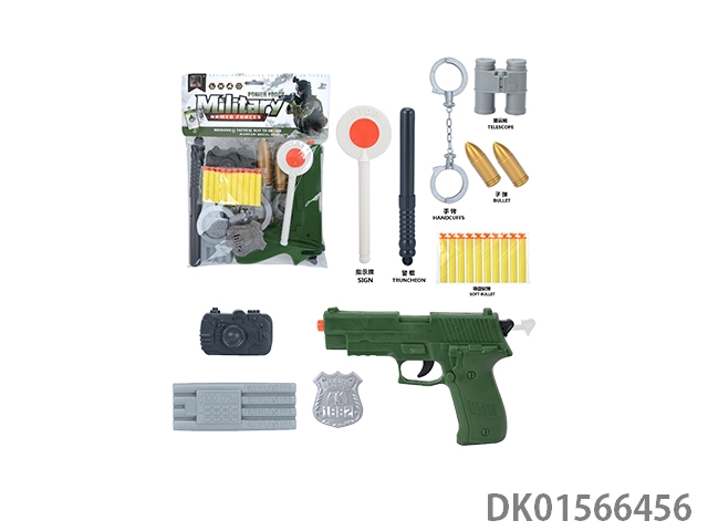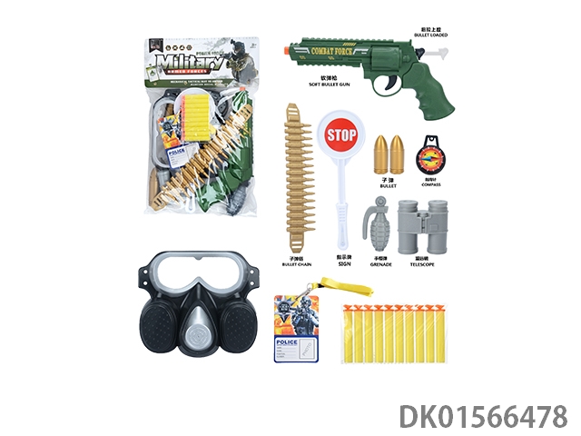 Military kit (handcuffs and bombs, compass and grenades * 2, badge and camera * 2, gold bullets * 2, hang tags and timed bombs, bullet clips and binoculars, and revolver soft ammunition gun)