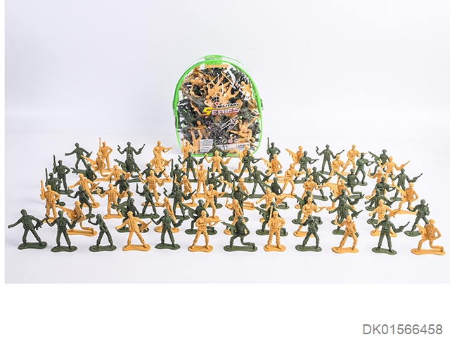 Military kit (bullet chains, handcuffs, batons, parking signs, gold bullets, walkie talkies, compasses, timed bombs, grenades, connected gun targets, kettles, binoculars, gun targets, bullet clips, and may fourth soft shell guns)
