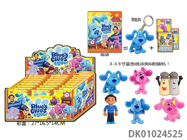 Single 3-3.5 inch blue spotted dog (with key ring) and 3 cards, 24 tin bag display boxes, cards and 6 dolls in tin bags